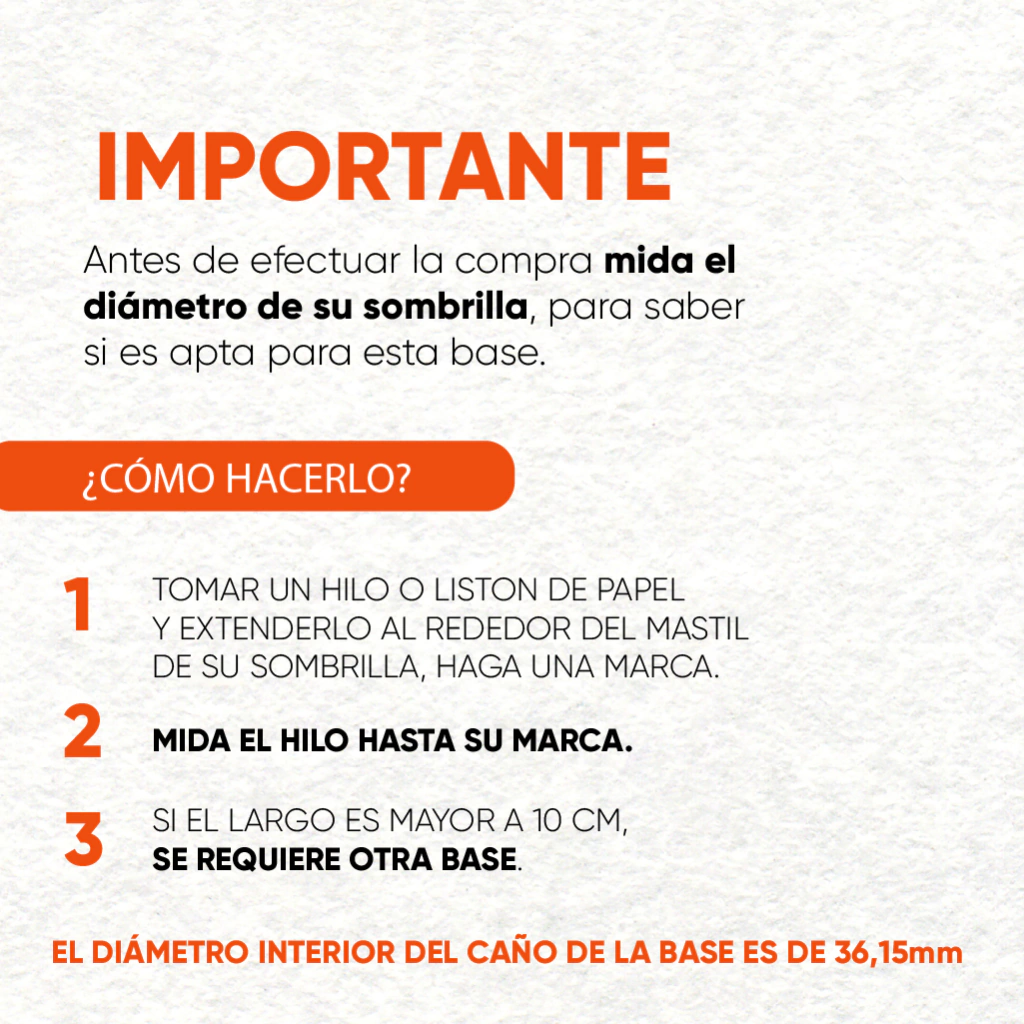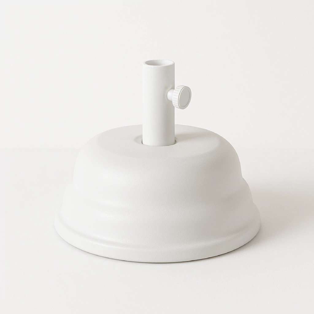Base para sombrilla realizada en PVC pintada en epoxi, con tratamiento previo de fosfatizado sobre elementos metálicos, rellena de cemento.