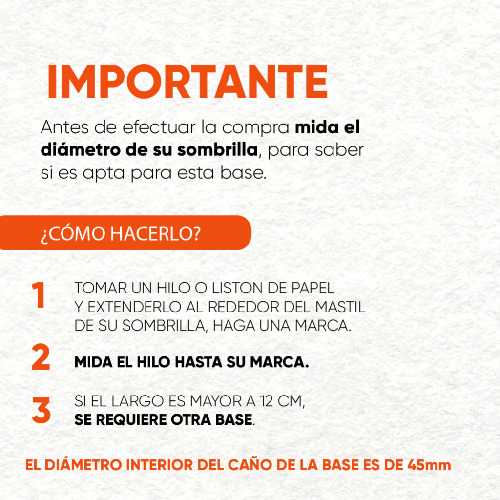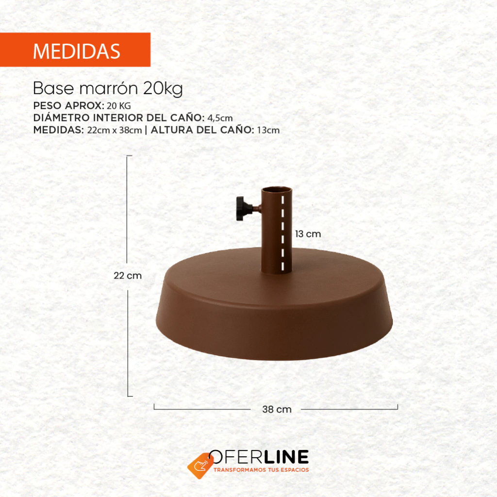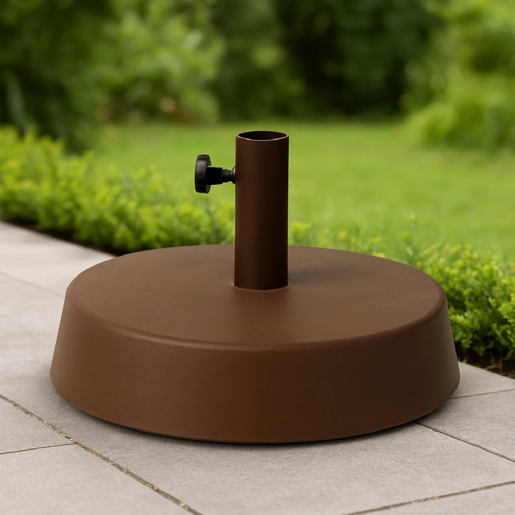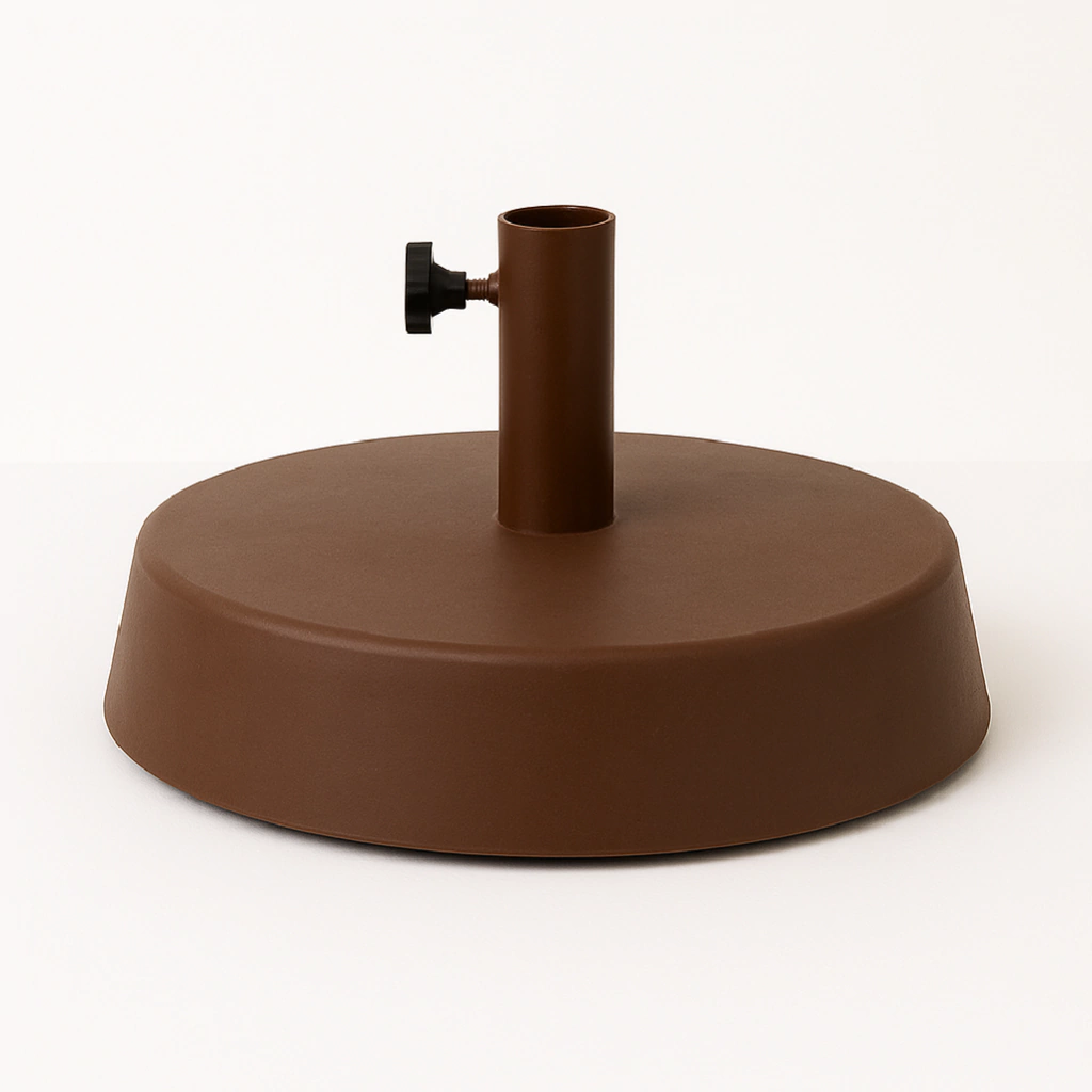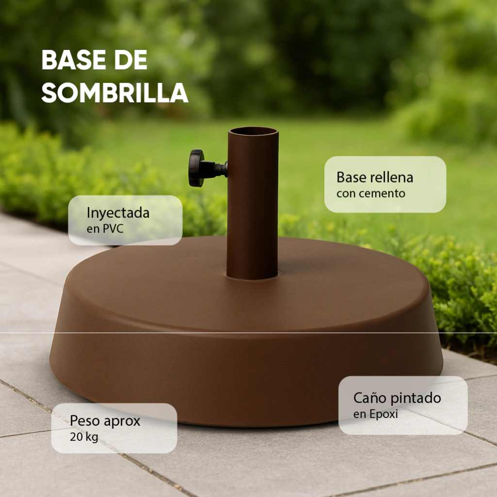 Base para sombrilla realizada en PVC pintada en epoxi, con tratamiento previo de fosfatizado sobre elementos metálicos, rellenas de cemento.