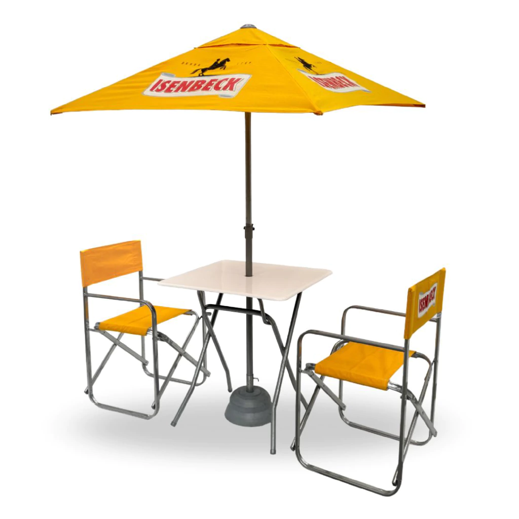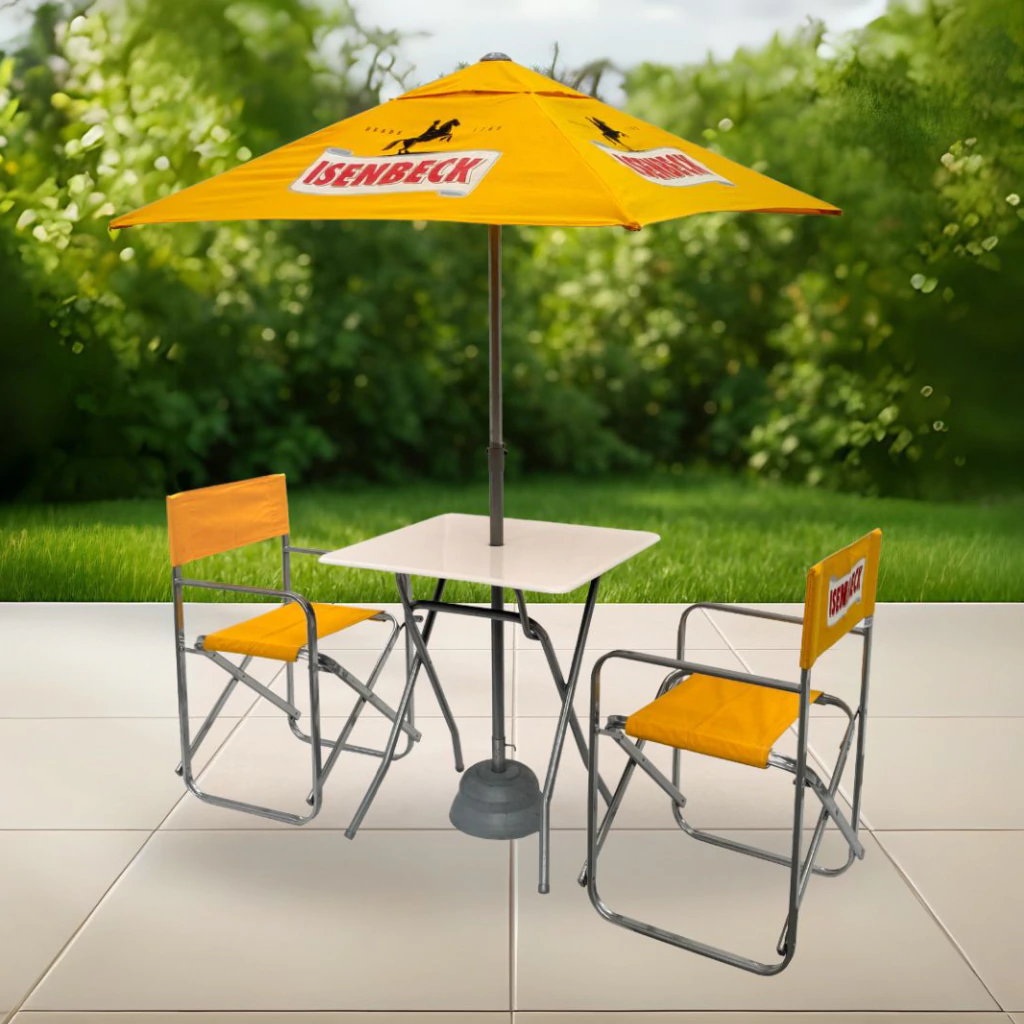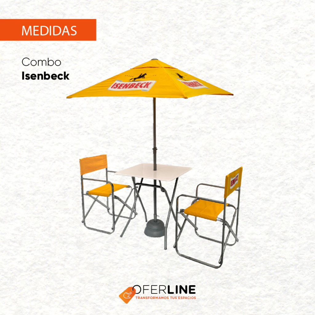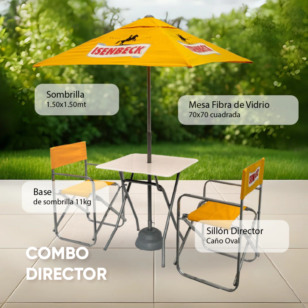 Juego completo Compuesto por: 2 sillones director de caño oval lona acrílica con logo Isenbeck + Mesa cuadrada 70x70cm plegable de fibra de vidrio reforzada + 1 Sombrilla cuadrada 1.50x1.50mt lona acrílica con logo Isenbeck + 1 Base para Sombrilla 11kg gris.