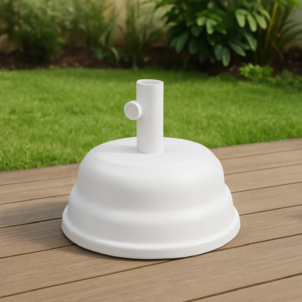 D) Base para sombrillas realizadas en PVC pintada en epoxi, con tratamiento previo de fosfatizado sobre elementos metálicos, rellenas de cemento. Peso aprox.: 11 kgs.