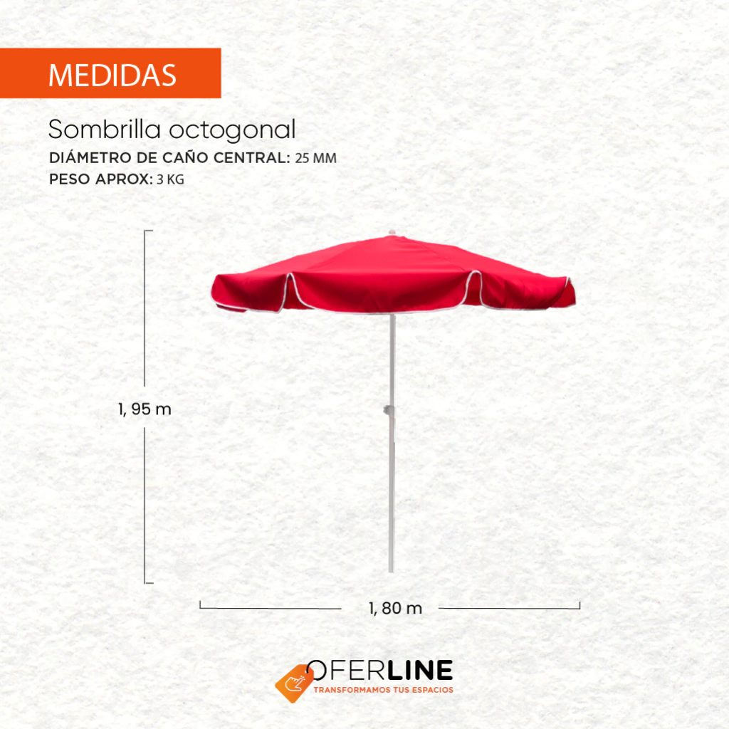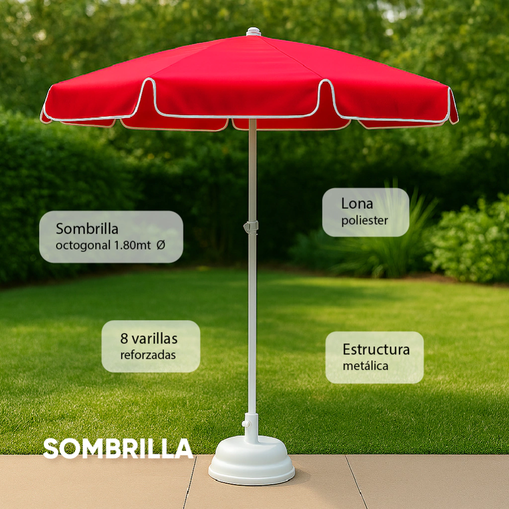 C) Sombrilla octogonal de 1,80mt (diámetro) reforzada ajustable. Varillas de hierro y lona poliéster impermeable para exterior.
