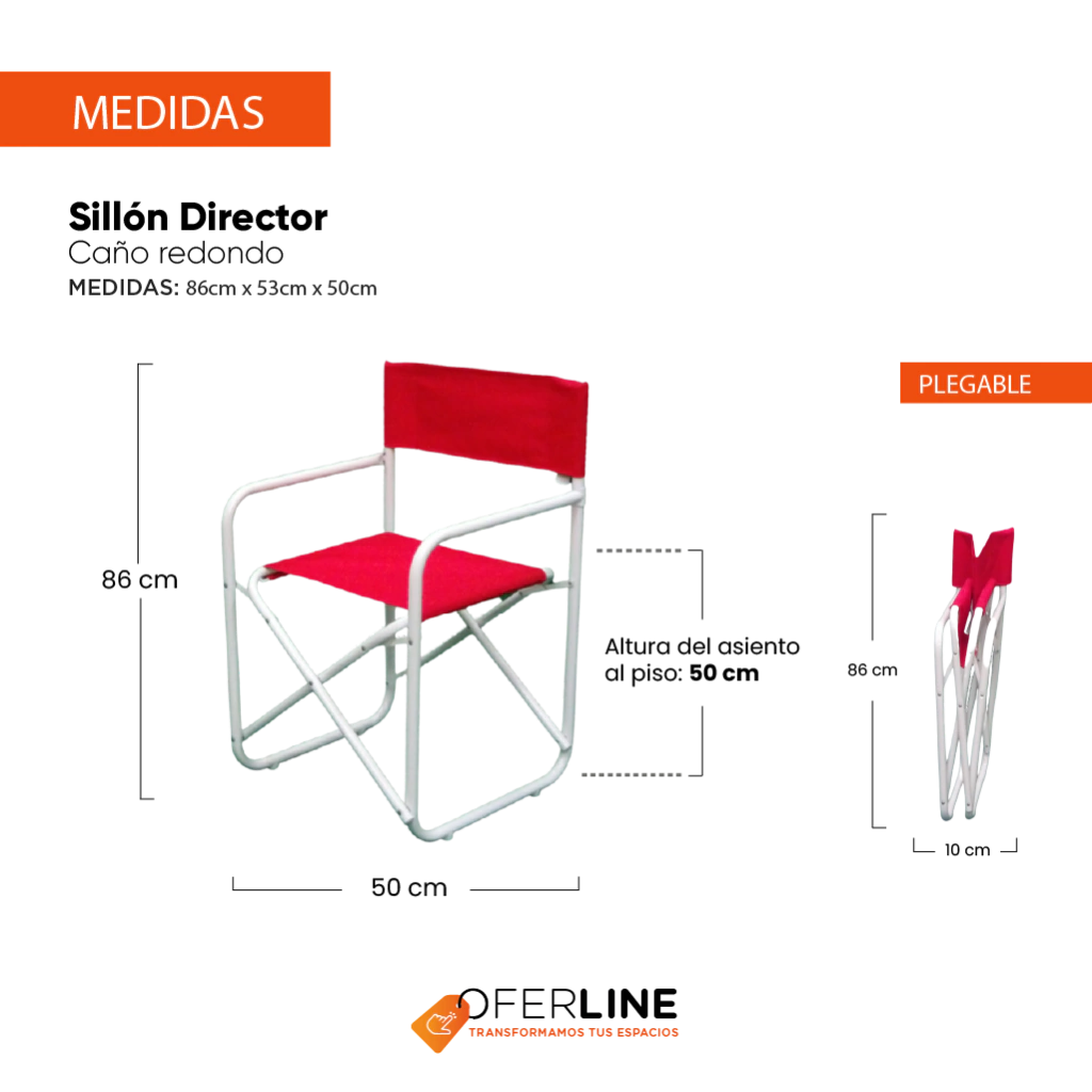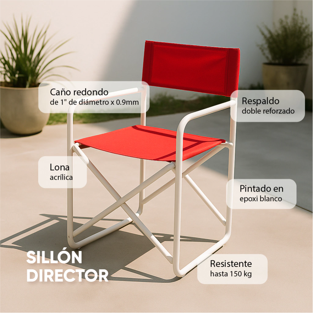 A) Sillones Director de caño redondo de 1" reforzado. Asiento y respaldo confeccionado en lona poliéster para exterior, con refuerzo interno: