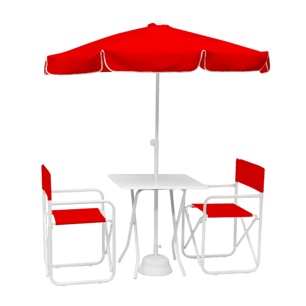 Juego completo Compuesto por: 2 Sillones Director de caño reforzado + Mesa plegable de fibra de vidrio con resina poliéster reforzada + 1 Sombrilla octogonal de 1,80mt. (diámetro) + 1 Base para Sombrilla 11kg color blanco