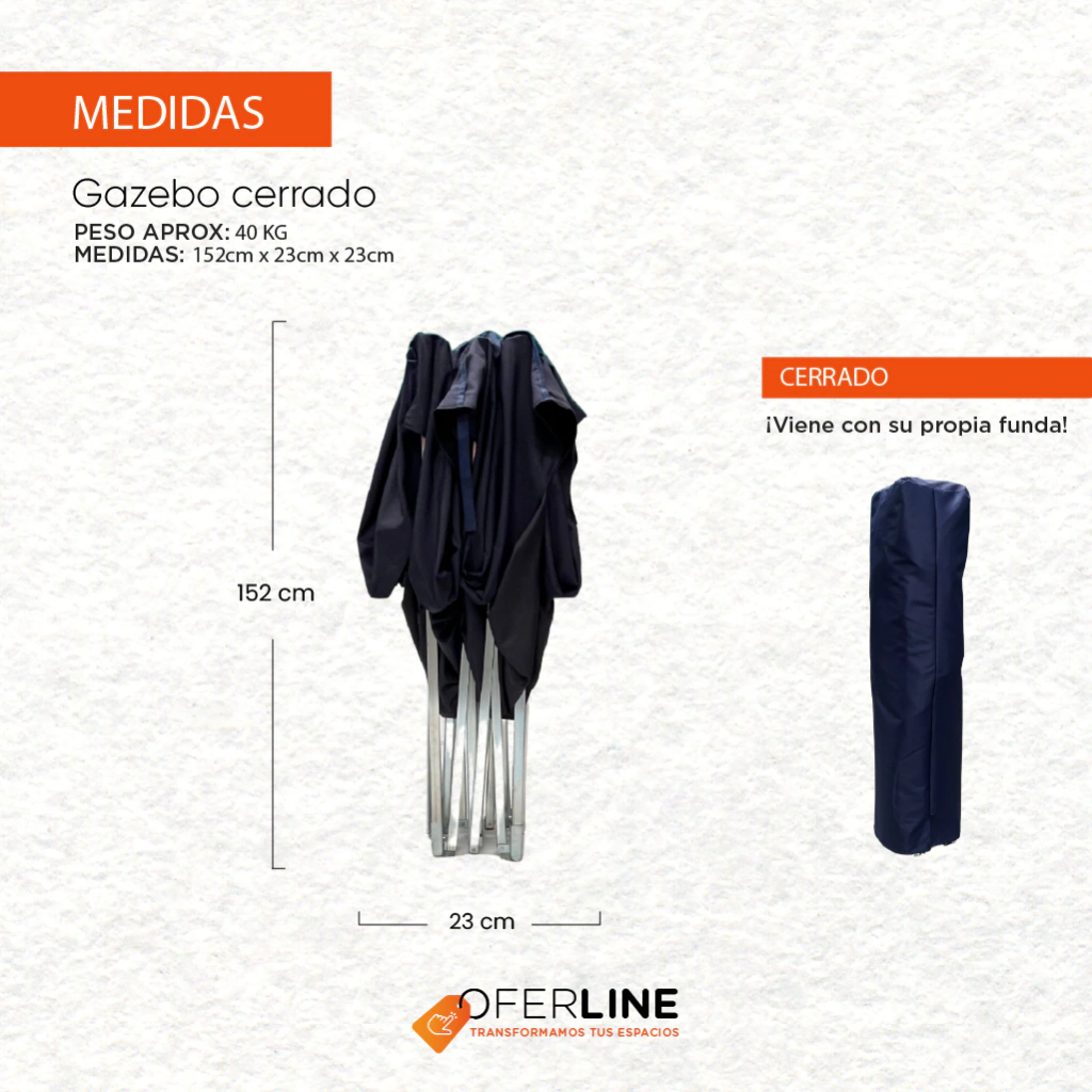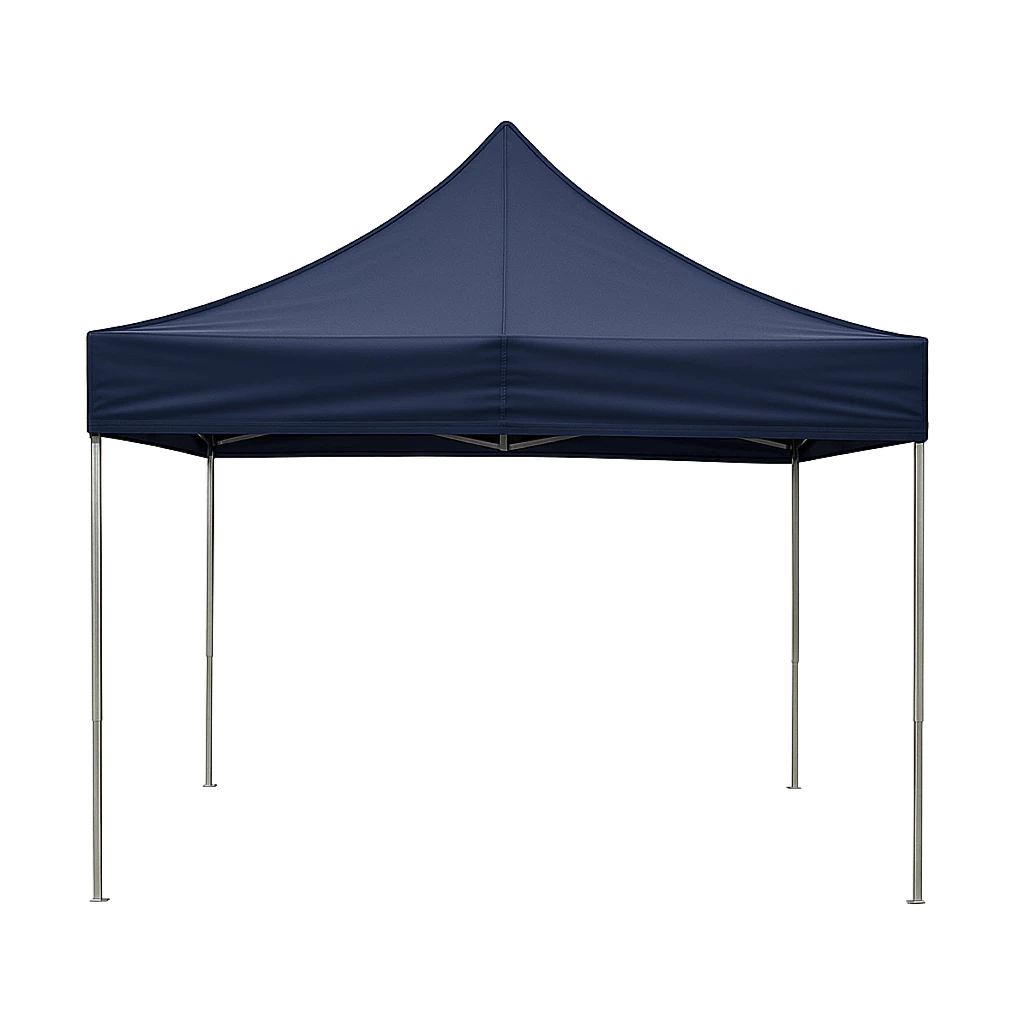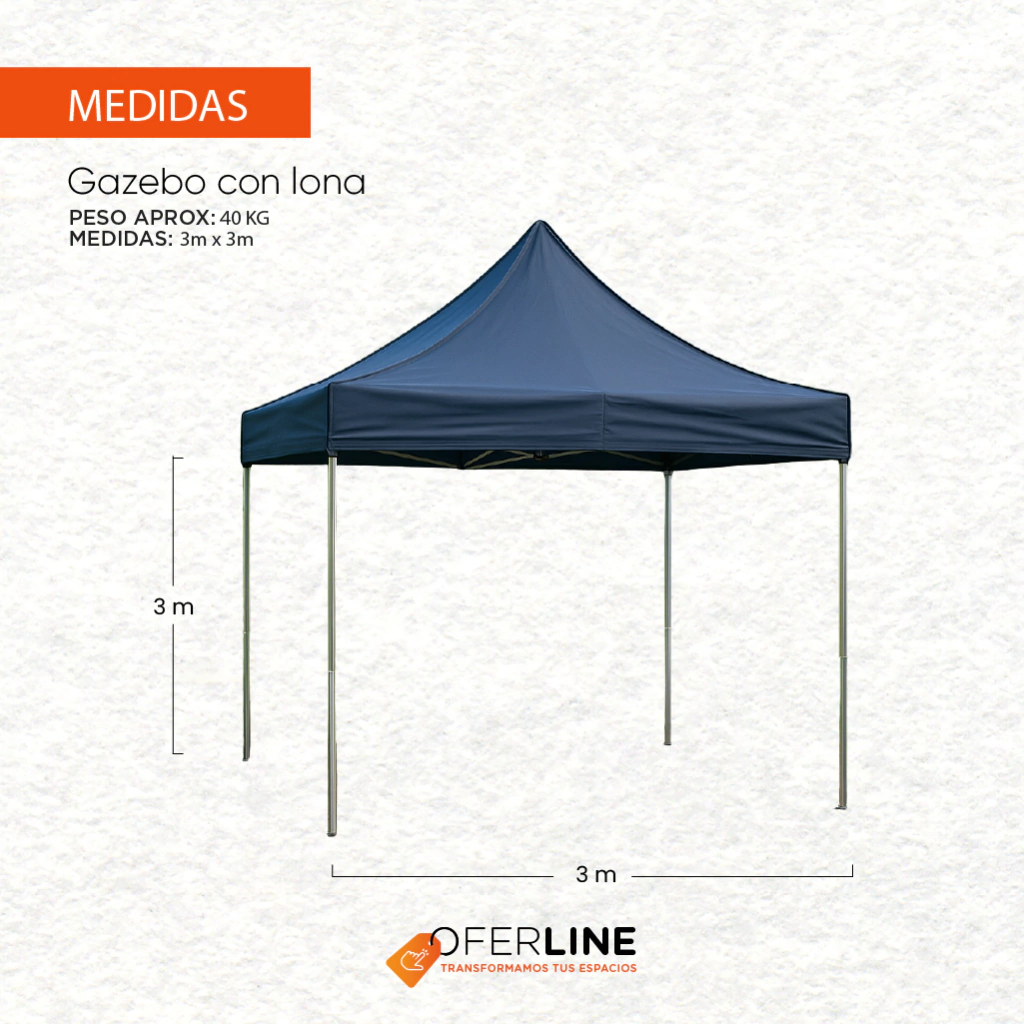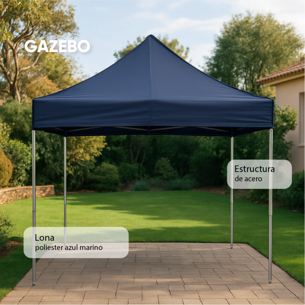 Gazebo plegable de 3x3mt estructura de acero y lona poliéster azul marino.