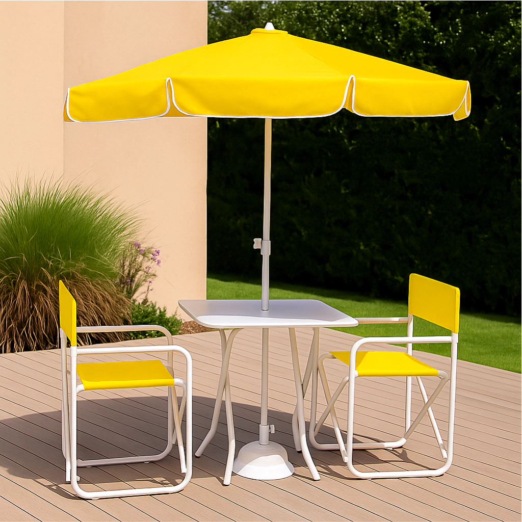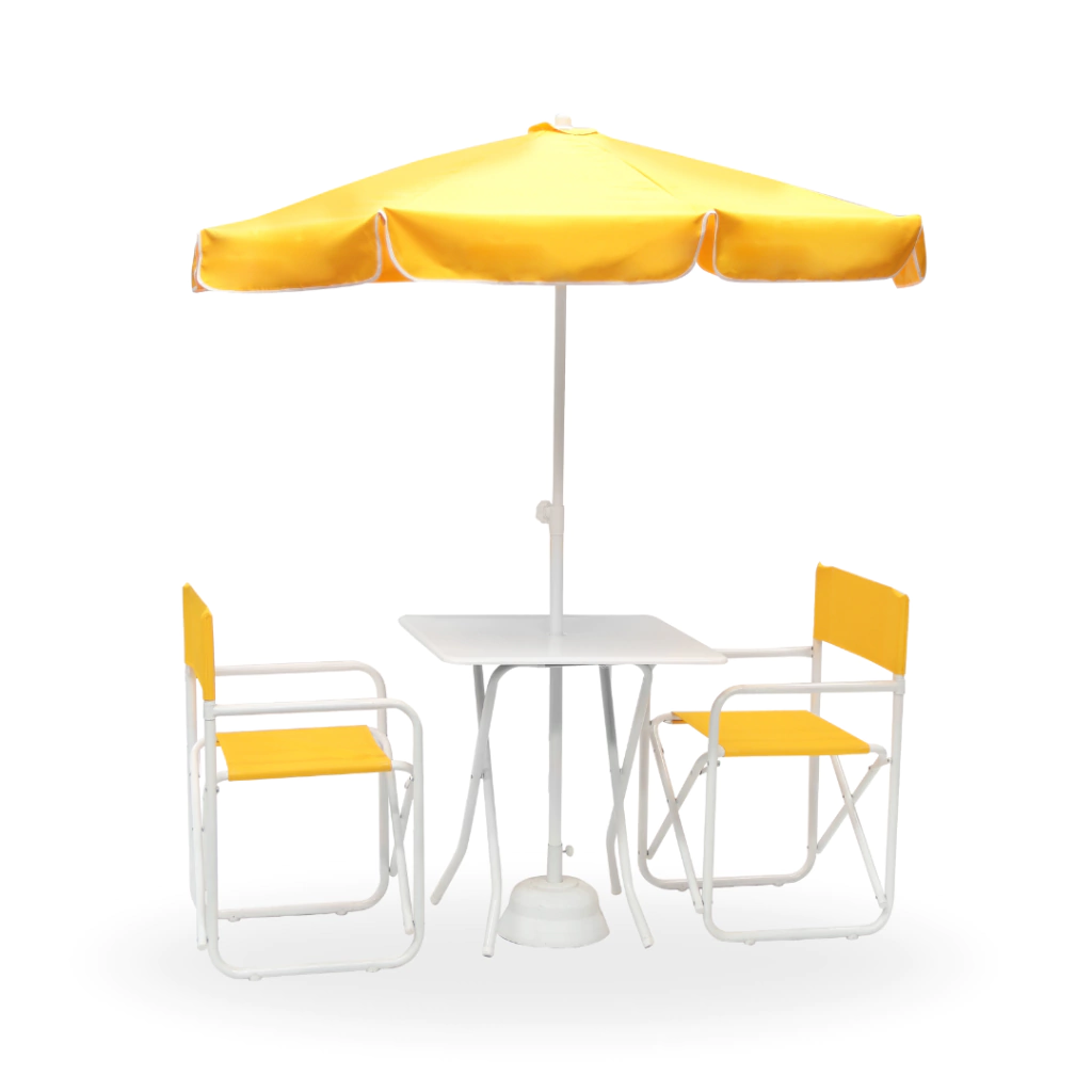 Juego completo Compuesto por: 2 sillones director de caño reforzado + Mesa plegable de fibra de vidrio con resina poliéster reforzada + 1 Sombrilla octogonal de 1,80mt. (diámetro) + 1 Base para sombrilla 11kg color blanco