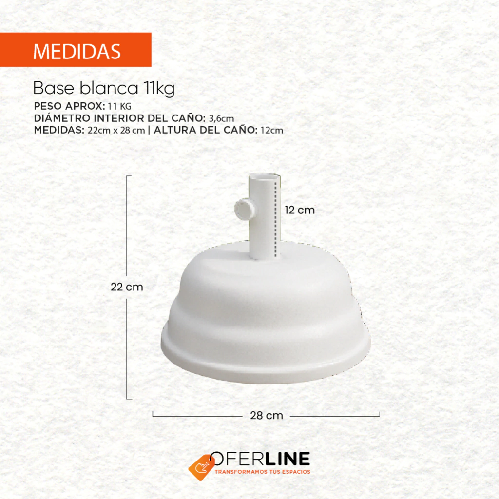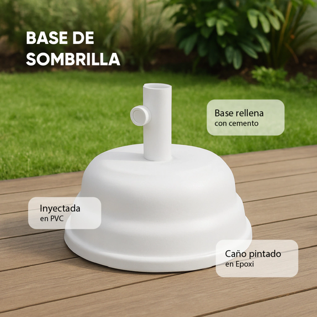 D) Base para sombrillas realizadas en PVC pintada en epoxi, con tratamiento previo de fosfatizado sobre elementos metálicos, rellenas de cemento. Peso aprox.: 11 kgs.