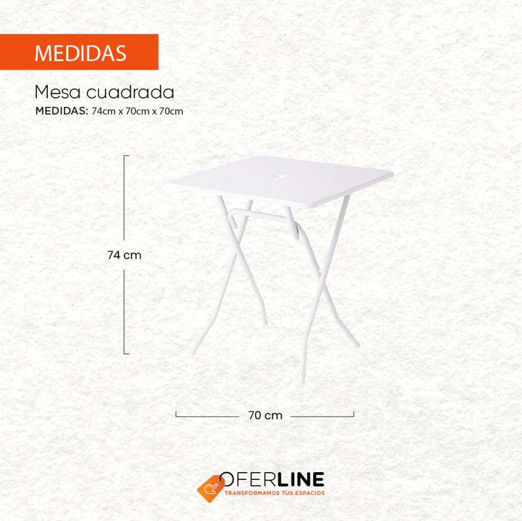 B) Mesa cuadrada de 70x70cm realizada en fibra de vidrio.