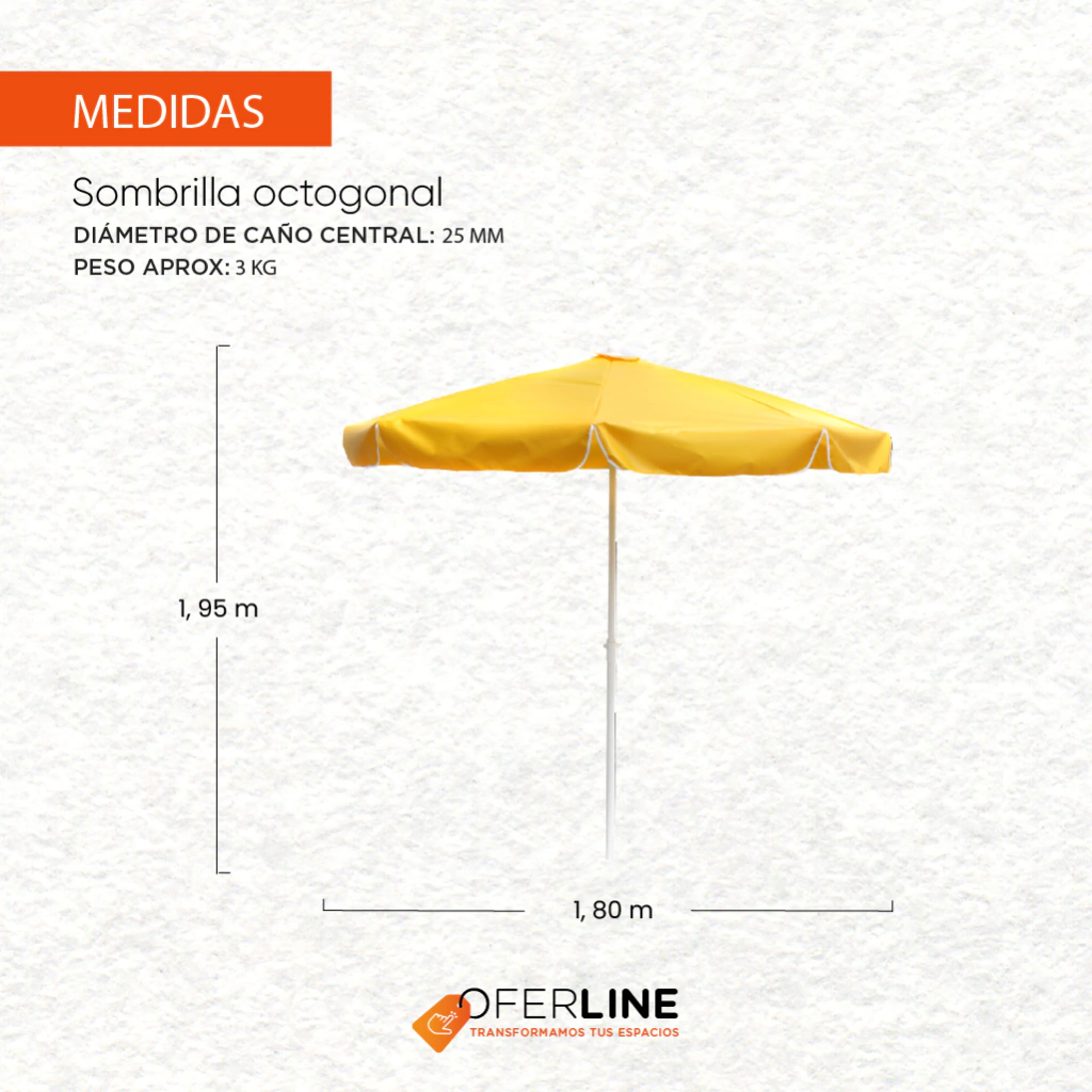 C) Sombrilla octogonal de 1,80mt (diámetro) reforzada ajustable. Varillas de hierro y lona poliéster impermeable para exterior.