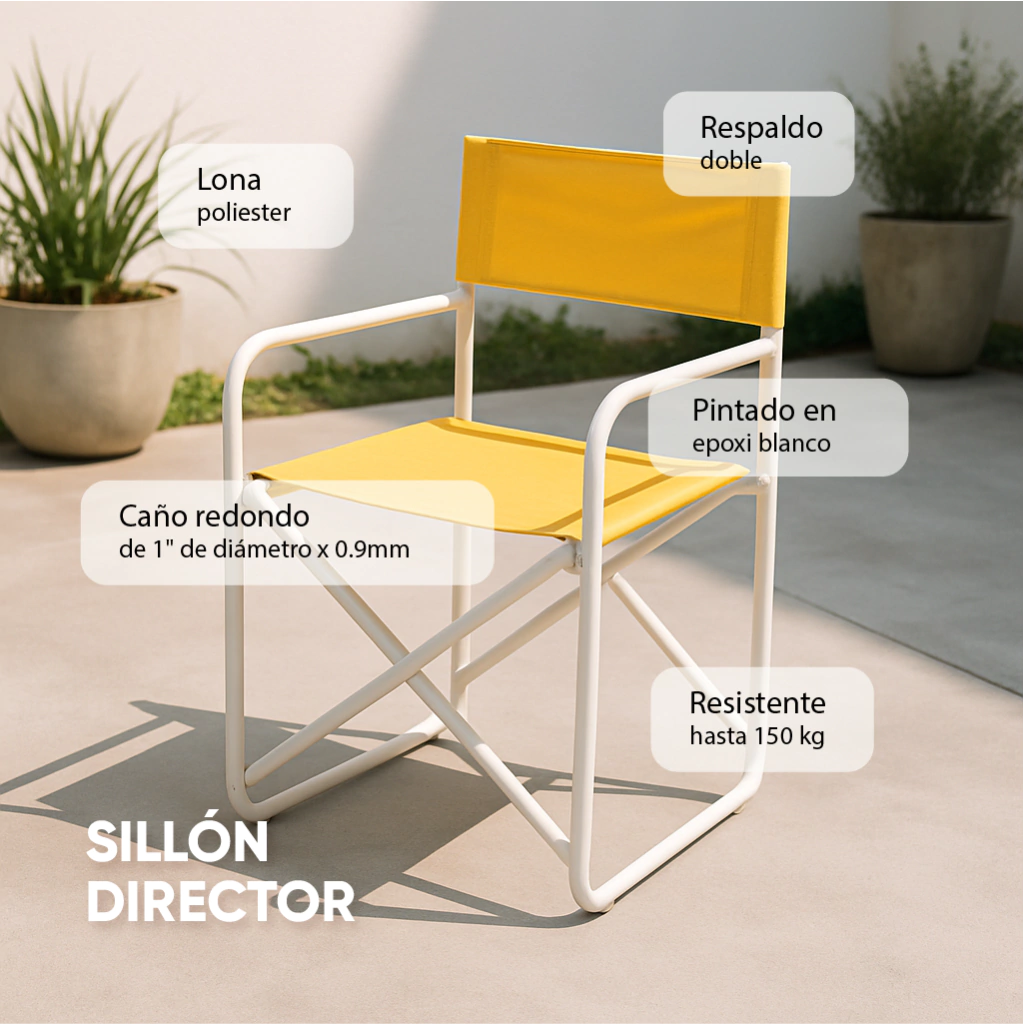 A) Sillones director de caño redondo de 1" reforzado. Asiento y respaldo confeccionado en lona poliéster para exterior, con refuerzo interno: