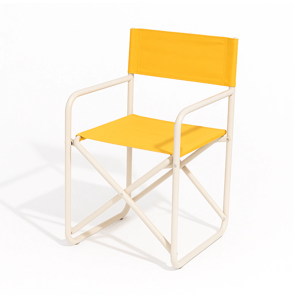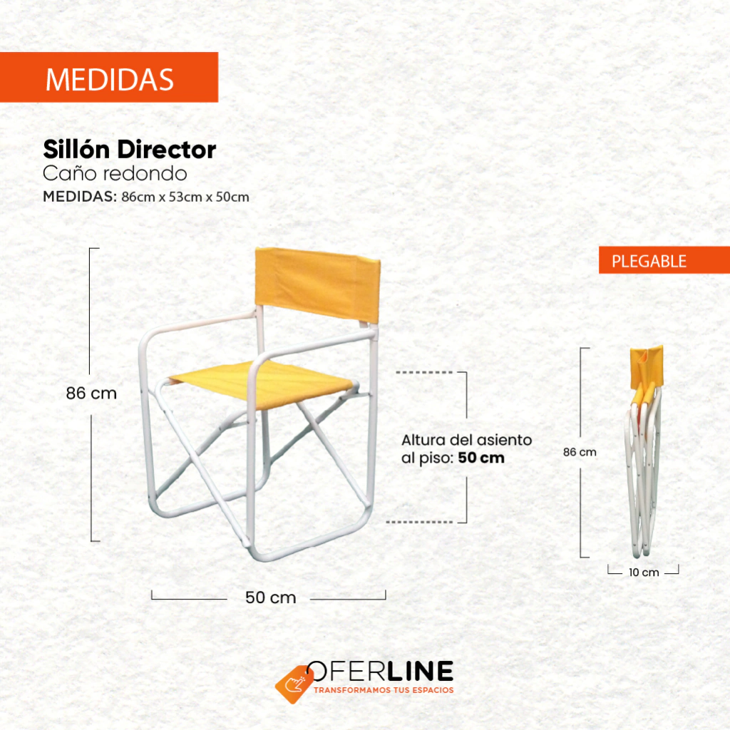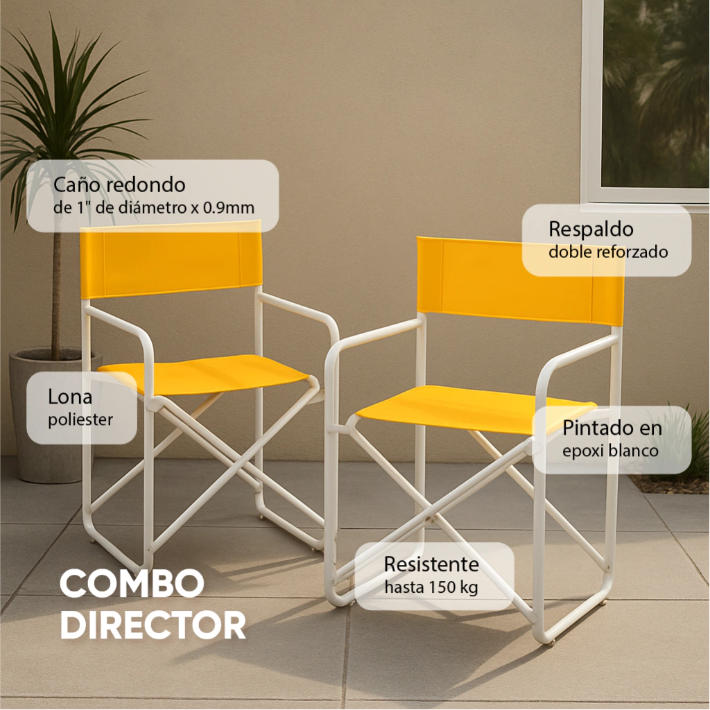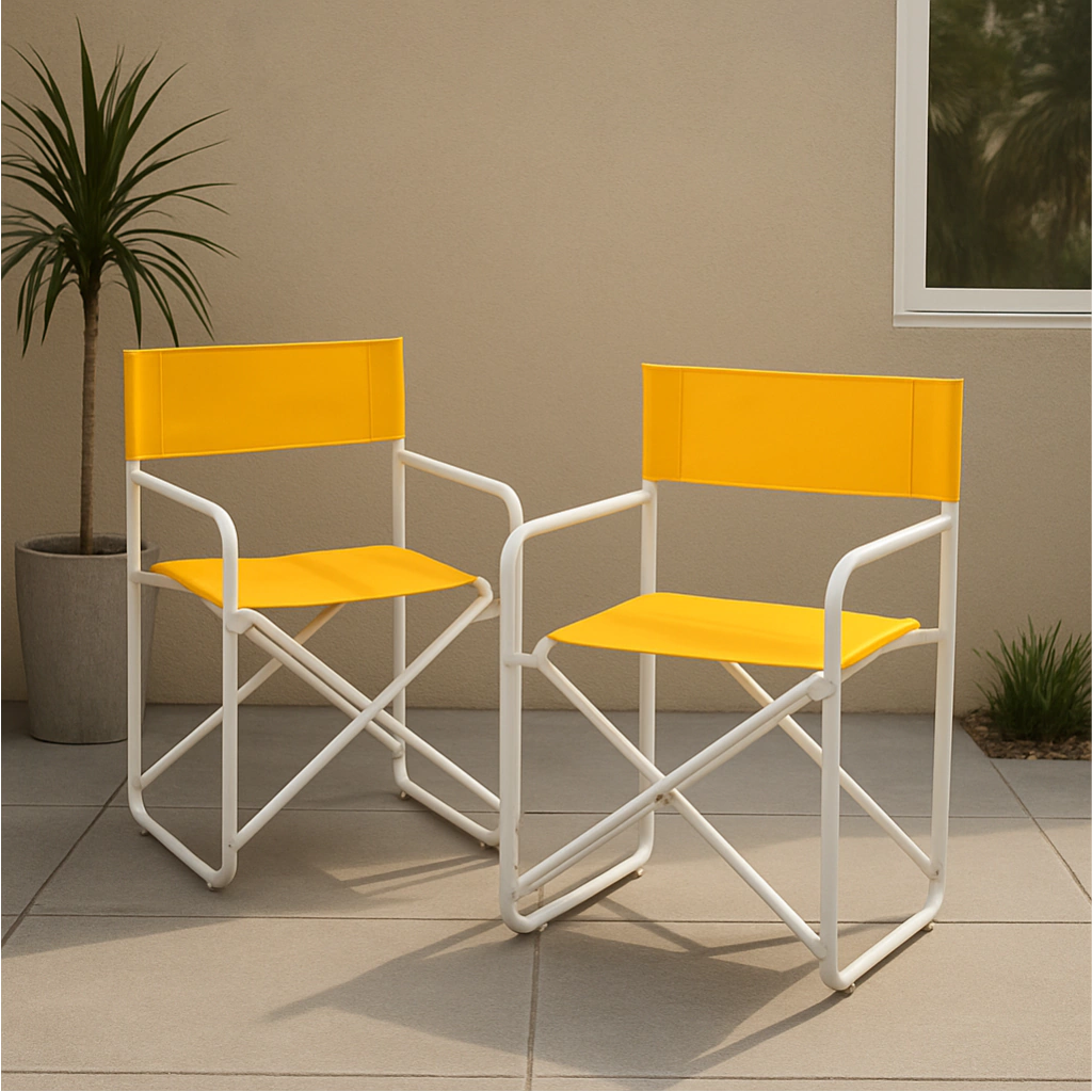 Juego de jardín exterior 2 Sillones director plegables, reforzados, de caño redondo. Estructura pintada en epoxi color blanco, con tratamiento previo de fosfatizado para uso exterior.