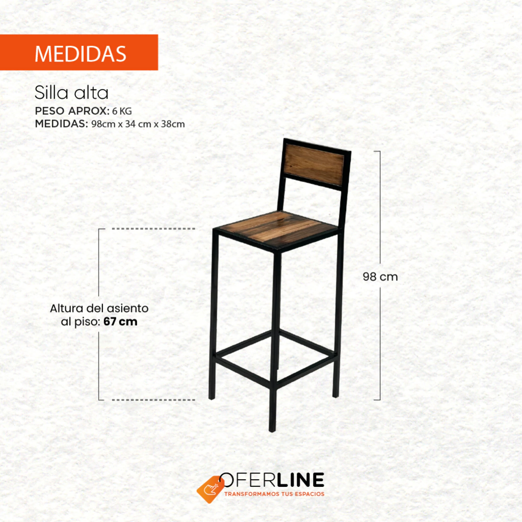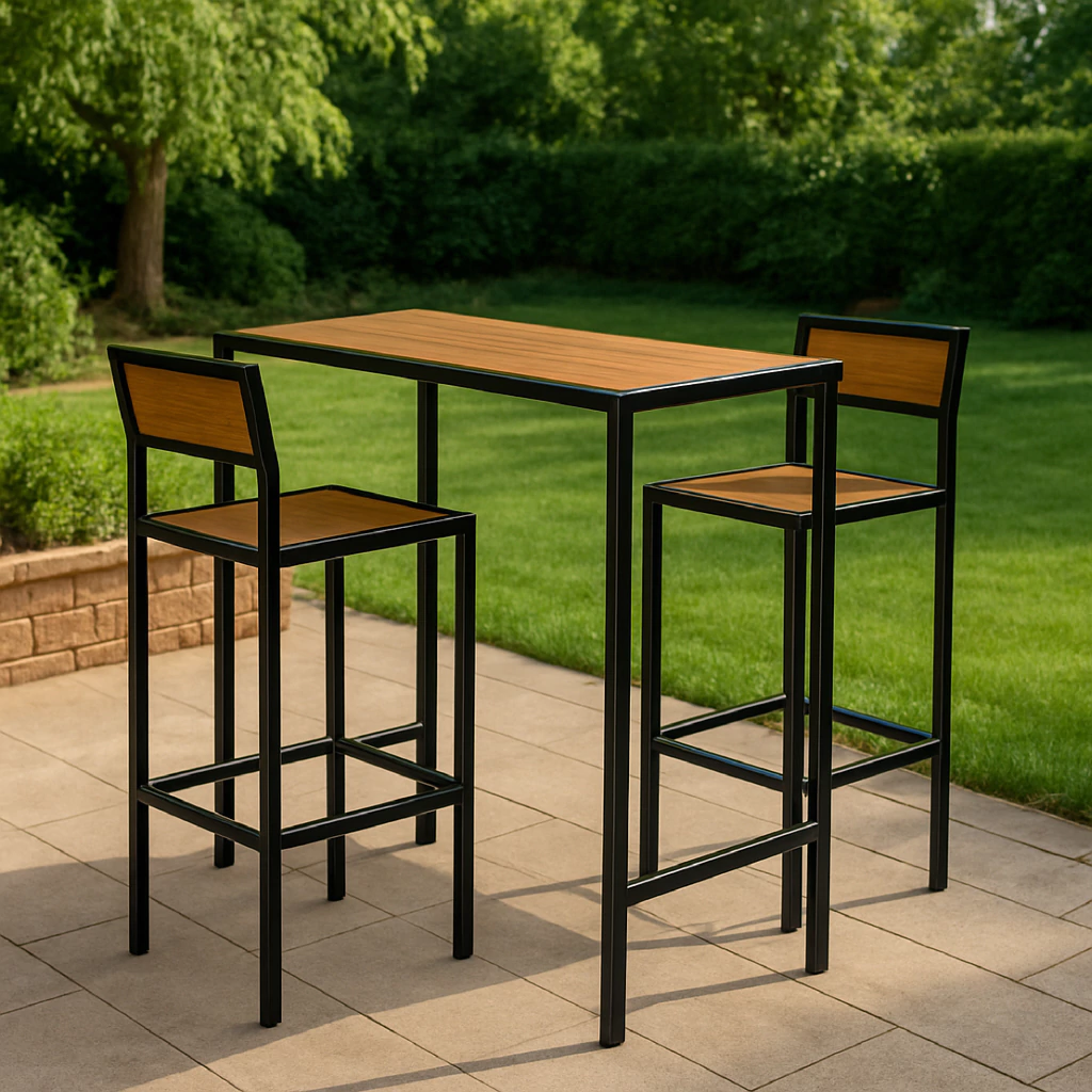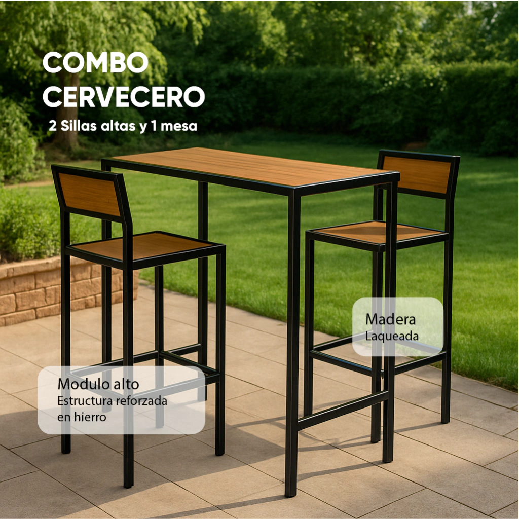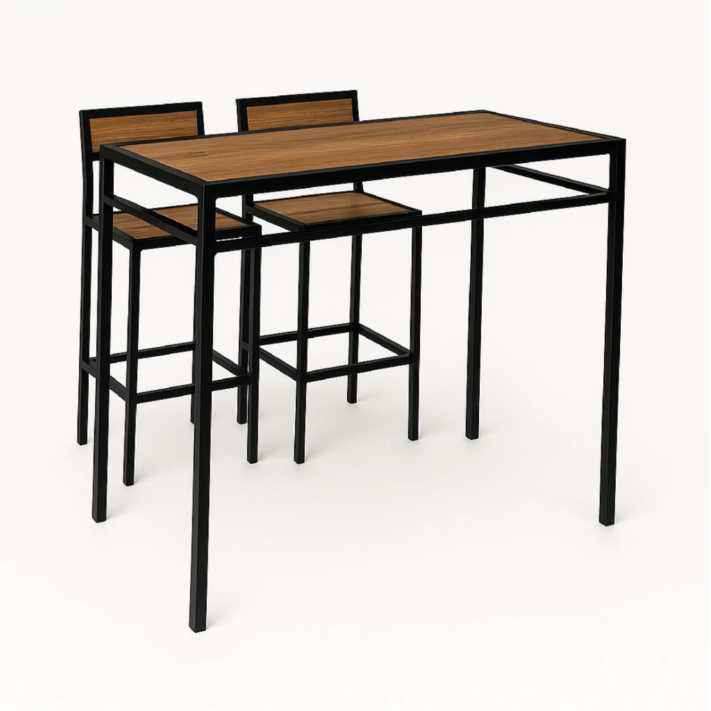 Modulo alto estructura reforzada de hierro y madera maciza laqueada compuesto de 2 sillas altas + 1 mesa alta