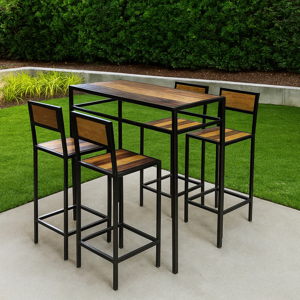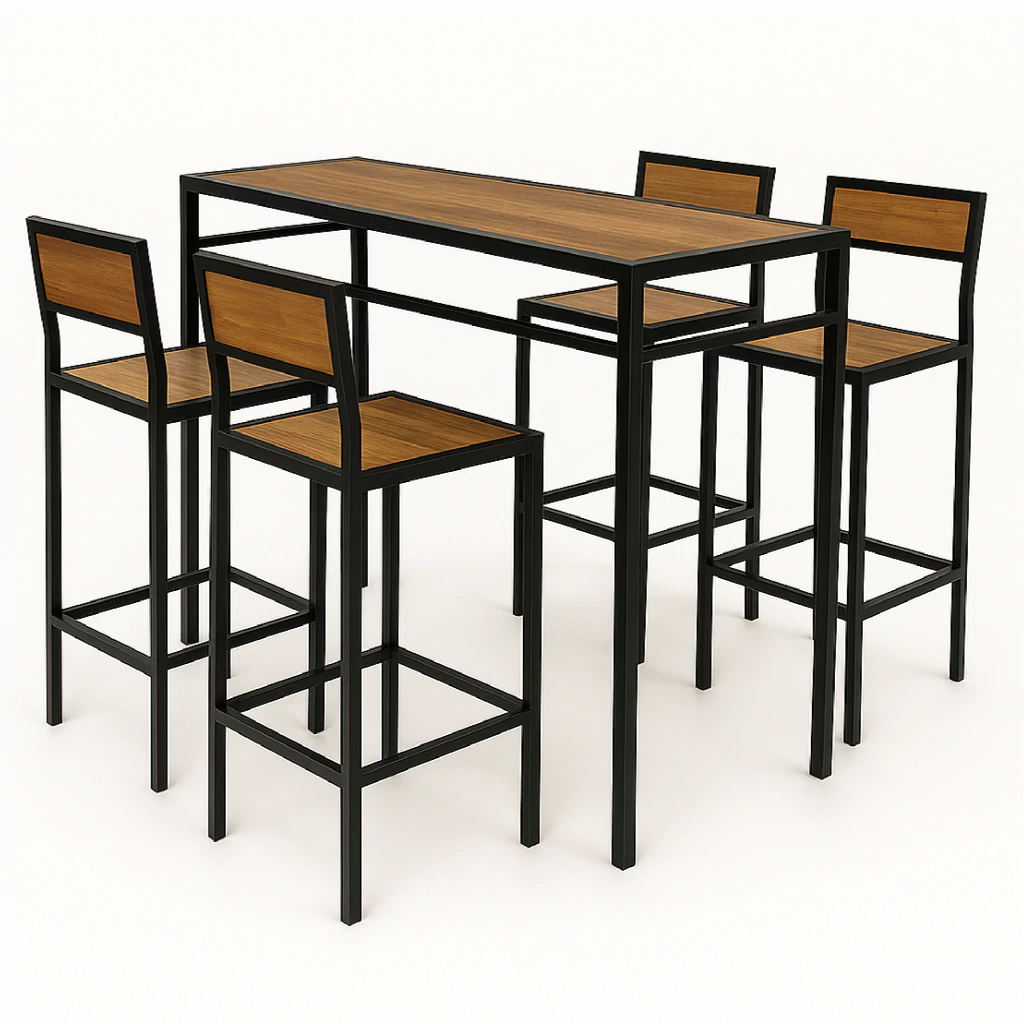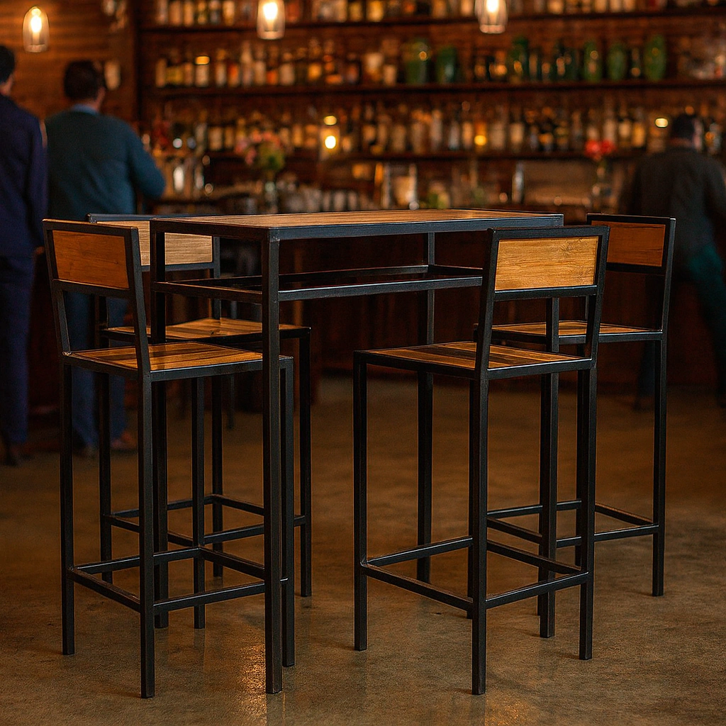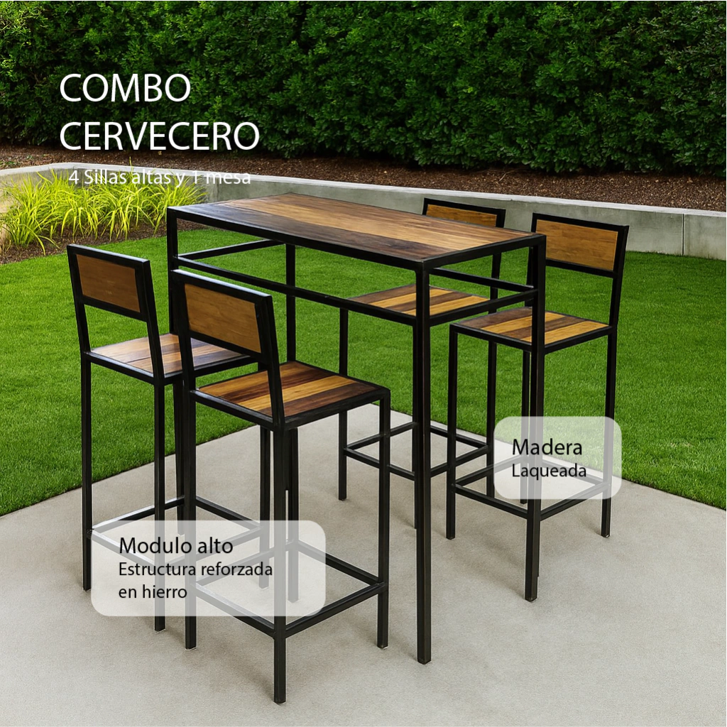 Modulo alto estructura reforzada de hierro y madera maciza laqueada compuesto de 4 sillas altas + 1 mesa alta