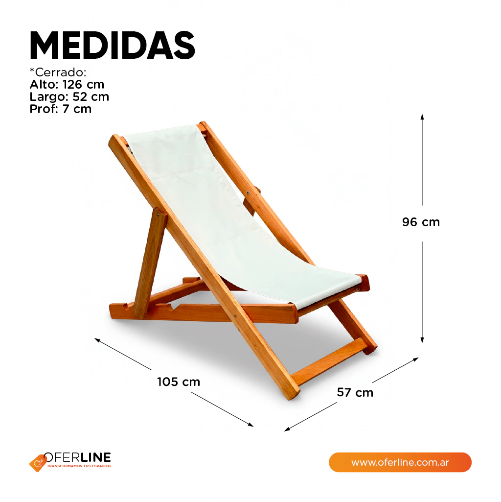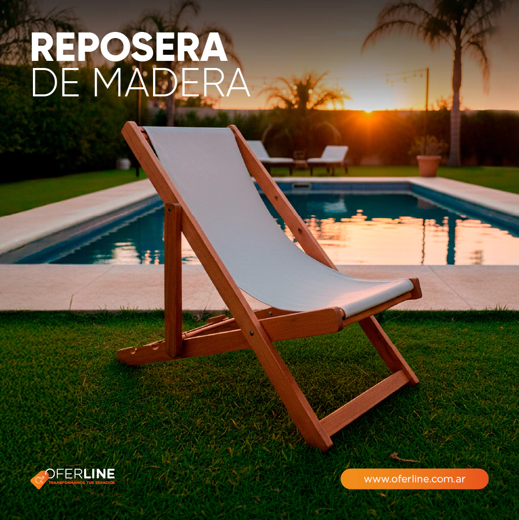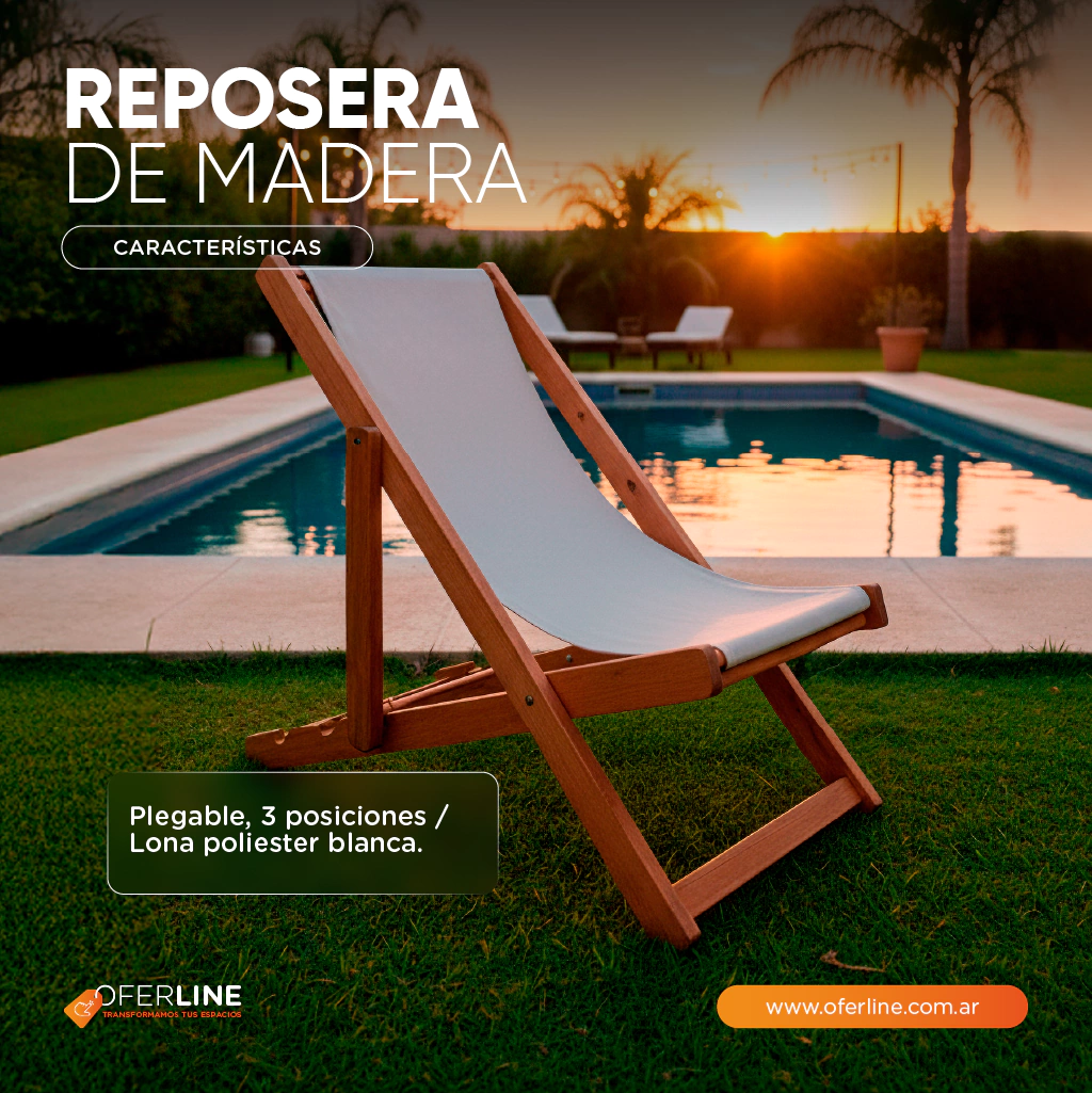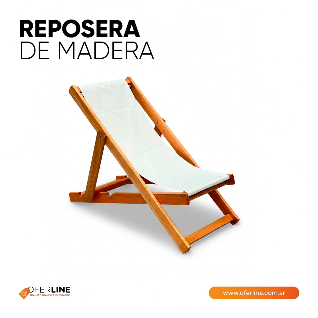 Reposera de madera con 3 posiciones, plegable, lona poliester blanca.