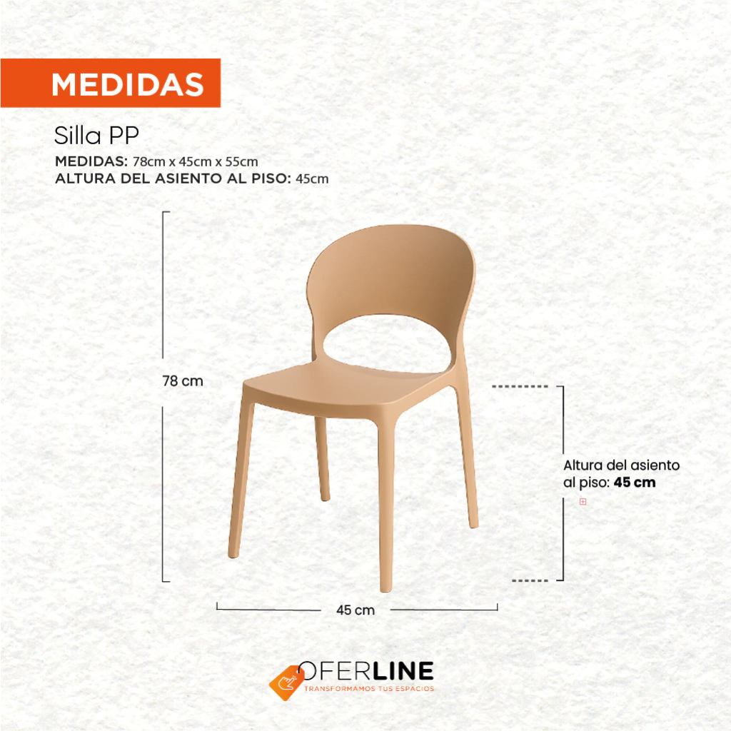 Silla de Polipropileno (PP) + Fibra de Vidrio reforzada, apilable y resistente al exterior, con tratamiento UV y garantía de 3 años. Resiste hasta 150kg