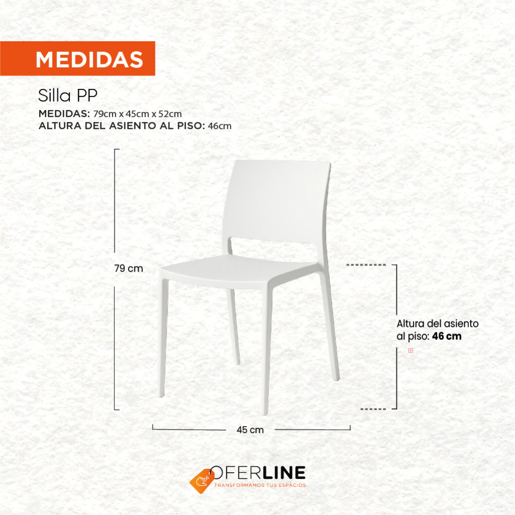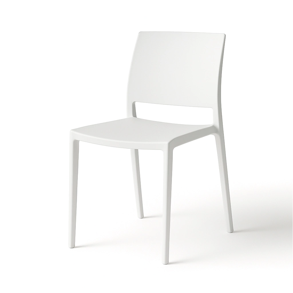 Silla de Polipropileno (PP) + Fibra de Vidrio reforzada, apilable y resistente al exterior, con tratamiento UV y garantía de 3 años. Resiste hasta 150kg