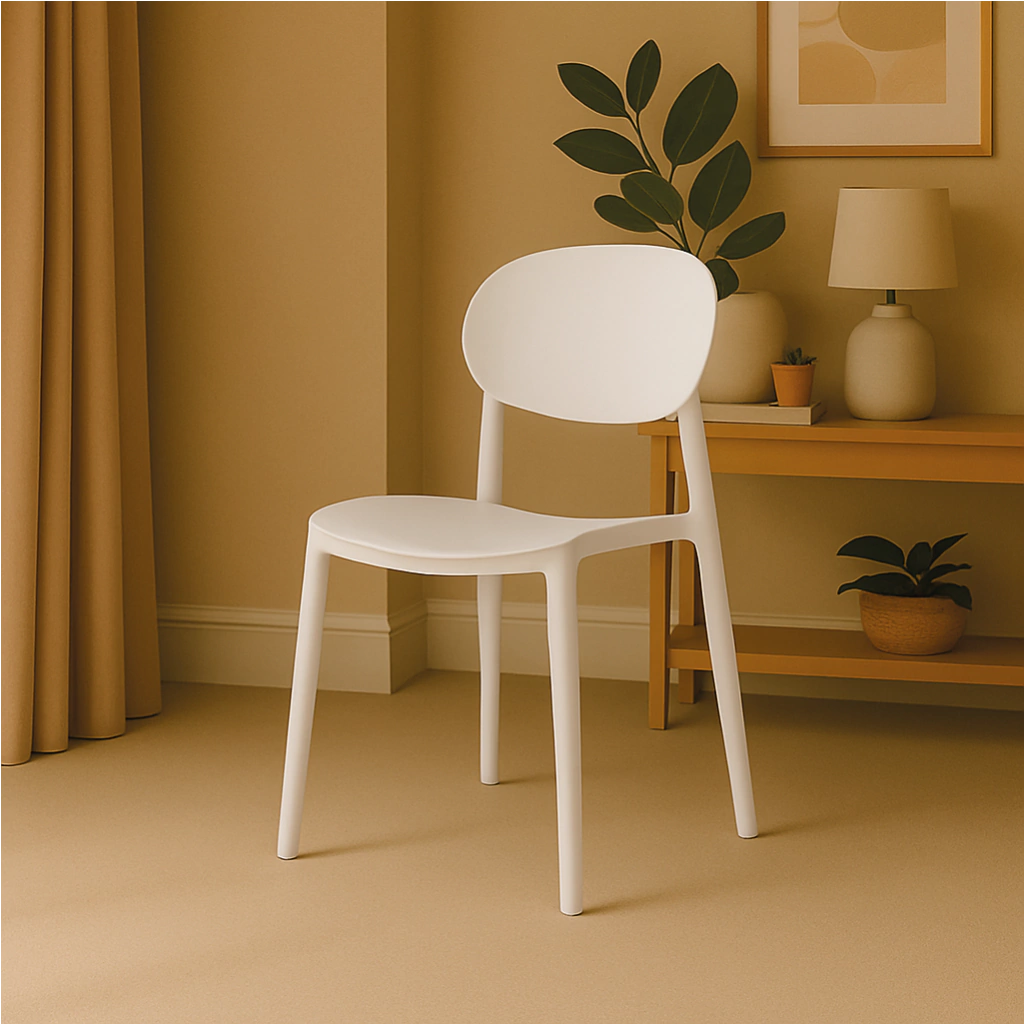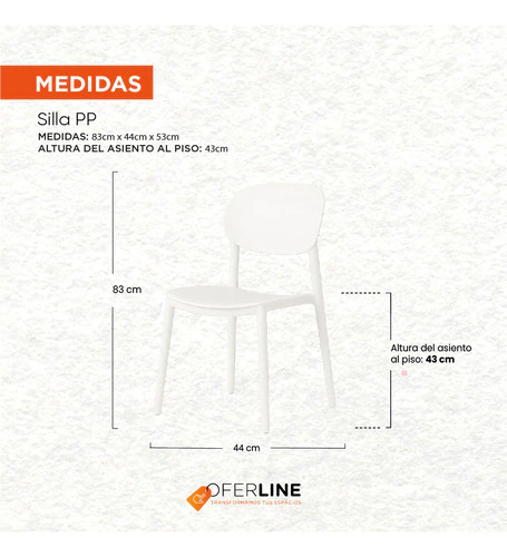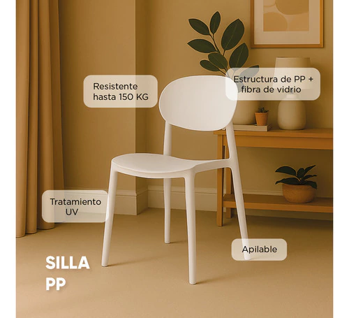 Silla de Polipropileno (PP) + Fibra de Vidrio reforzada, apilable y resistente al exterior, con tratamiento UV y garantía de 3 años. Resiste hasta 150kg