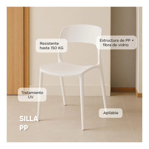 Silla de Polipropileno (PP) + Fibra de Vidrio reforzada, apilable y resistente al exterior, con tratamiento UV y garantía de 3 años. Resiste hasta 150kg