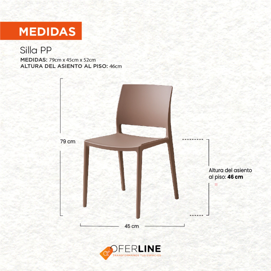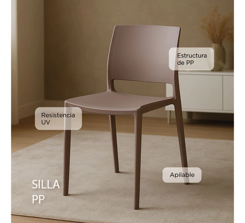 Silla de Polipropileno (PP) + Fibra de Vidrio reforzada, apilable y resistente al exterior, con tratamiento UV y garantía de 3 años. Resiste hasta 150kg