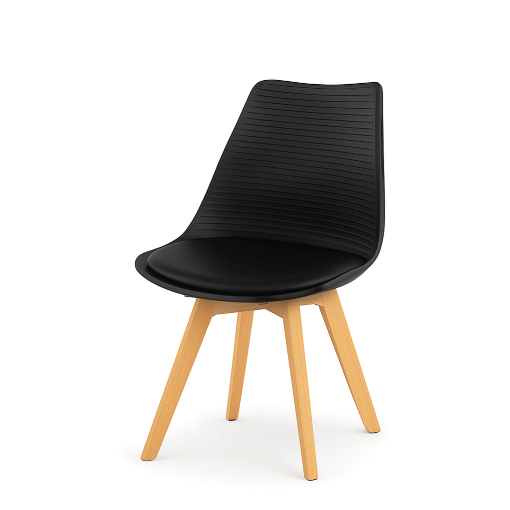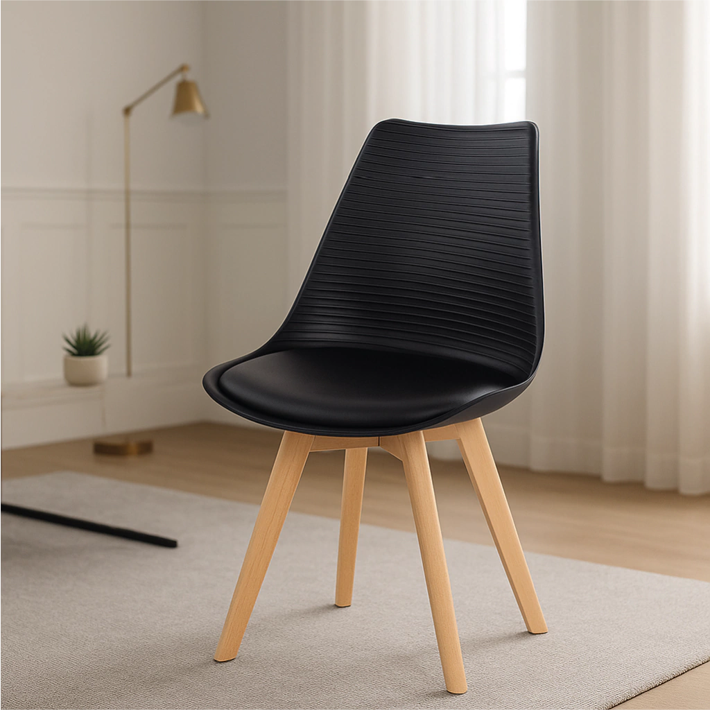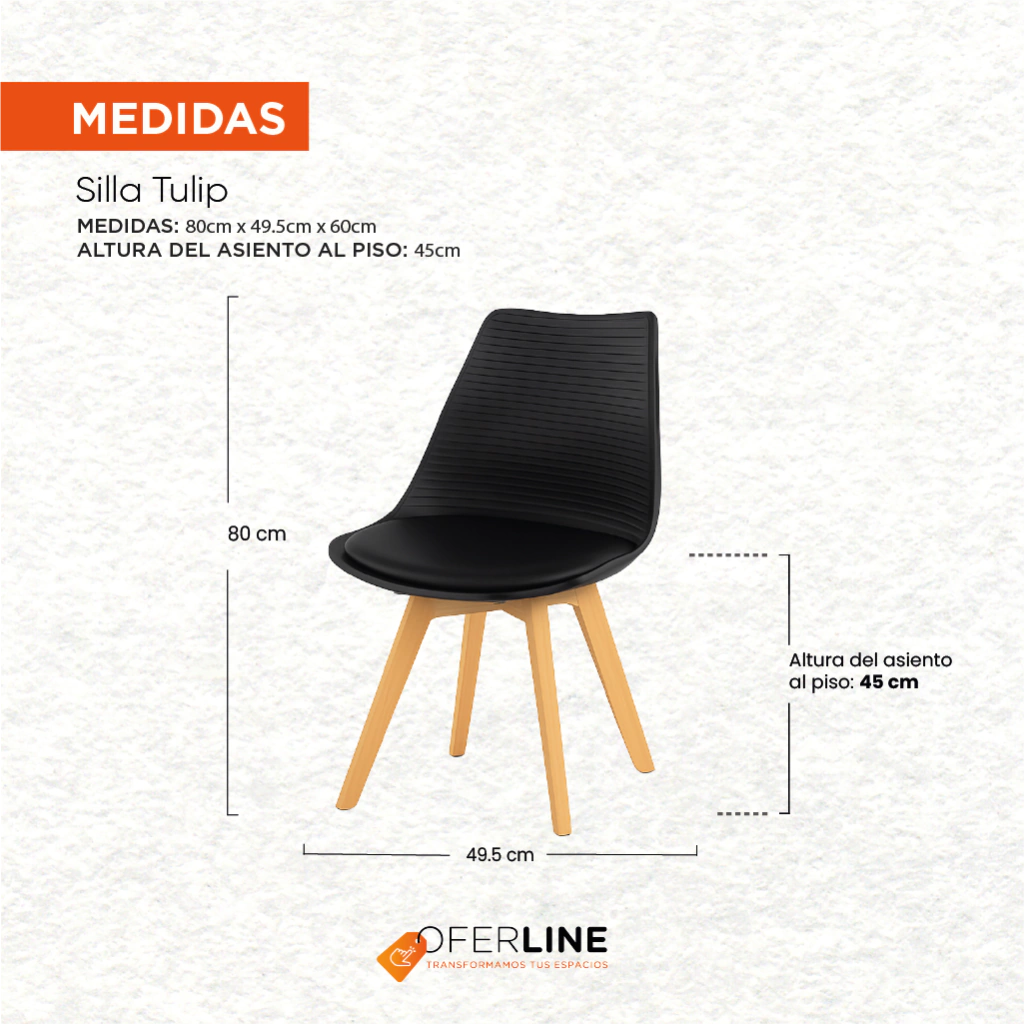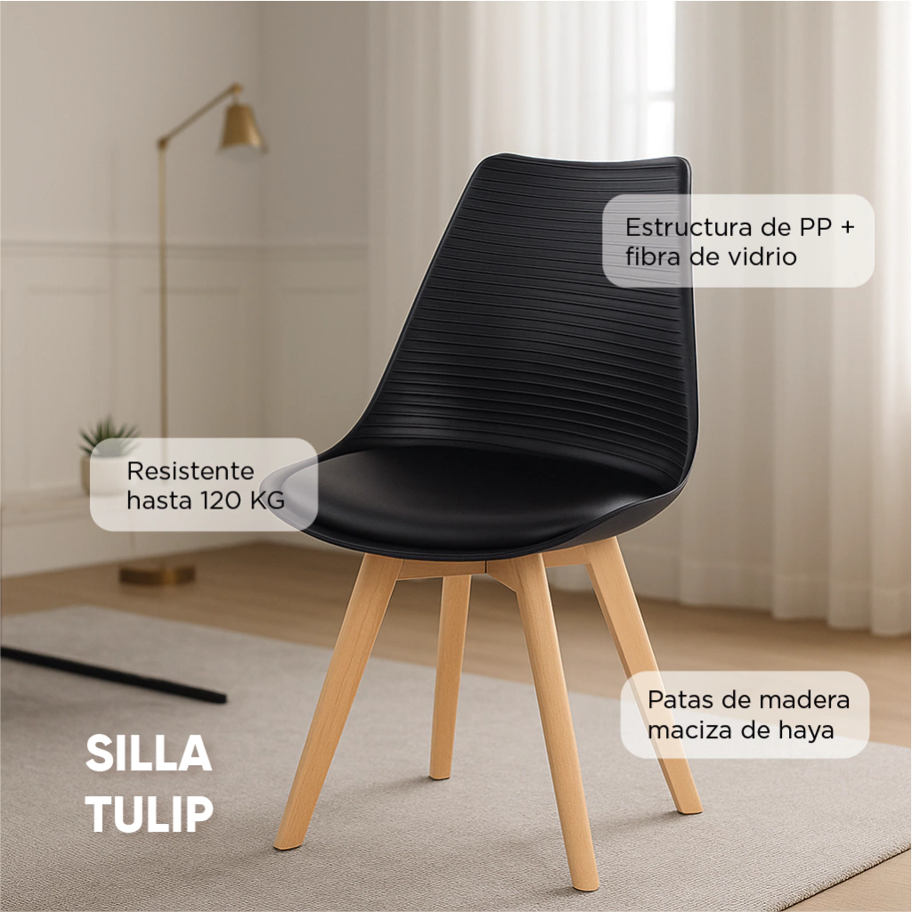 Silla Tulip de Polipropileno (PP) + Fibra de Vidrio reforzada, con tratamiento UV y garantía de 3 años. Asiento tapizado en ecocuero. Patas de madera maciza de haya, lustradas con laca poliuretánica. Resiste hasta 120kg