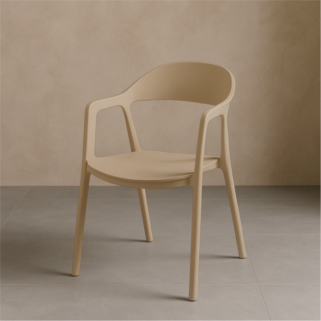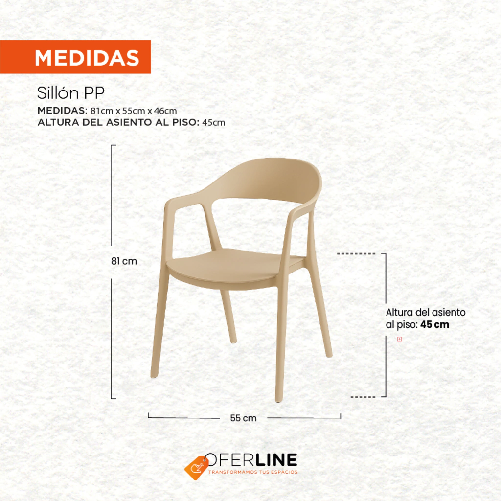 Sillón de Polipropileno (PP) + Fibra de Vidrio reforzada, apilable y resistente al exterior, con tratamiento UV y garantía de 3 años. Resiste hasta 150kg