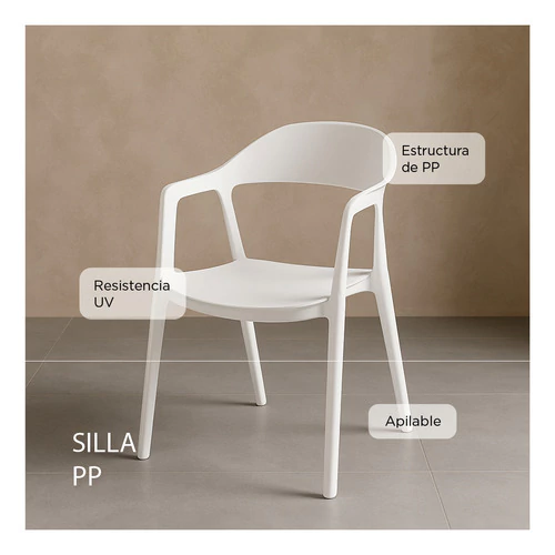 Sillón de Polipropileno (PP) + Fibra de Vidrio reforzada, apilable y resistente al exterior, con tratamiento UV y garantía de 3 años. Resiste hasta 150kg