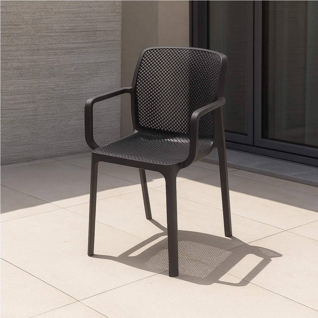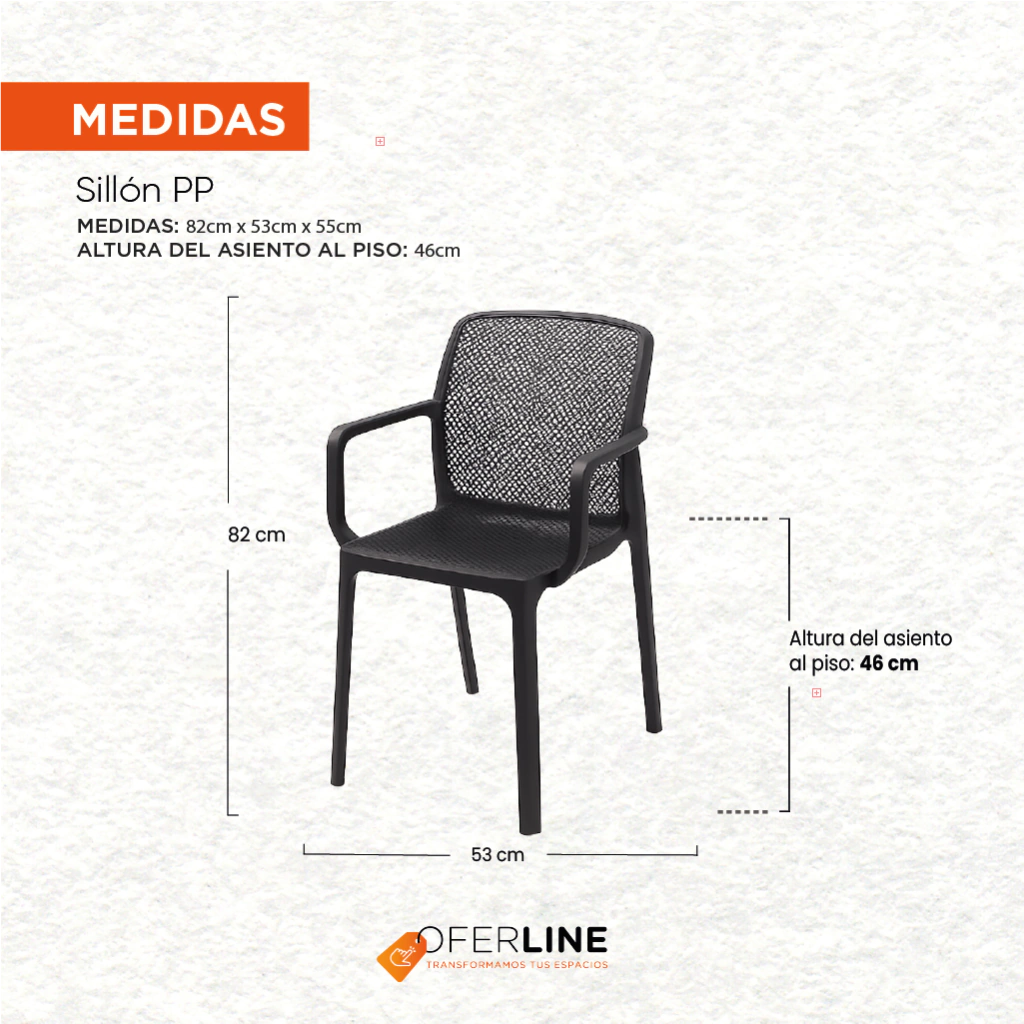 Sillón de Polipropileno (PP) + Fibra de Vidrio reforzada, apilable y resistente al exterior, con tratamiento UV y garantía de 3 años. Resiste hasta 150kg