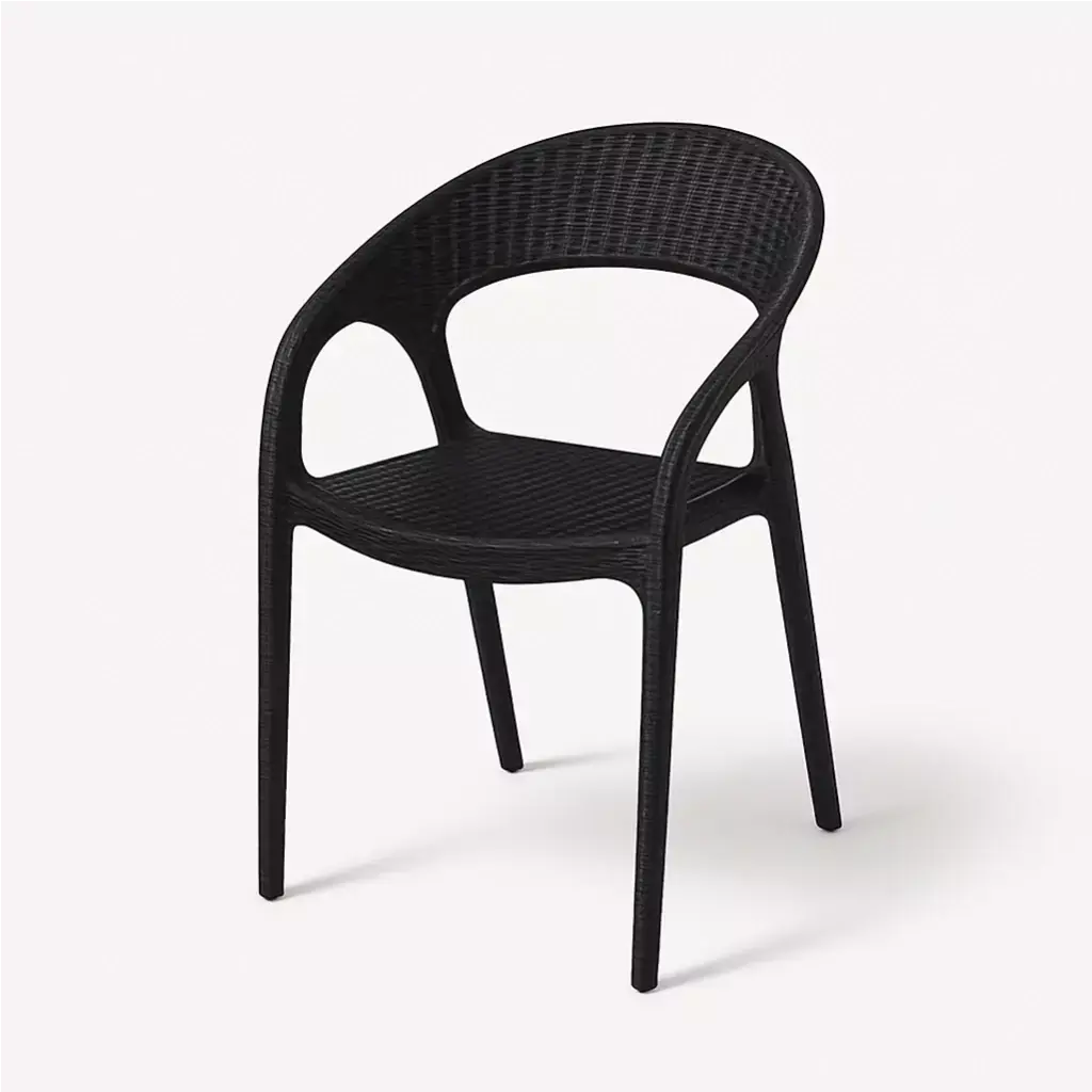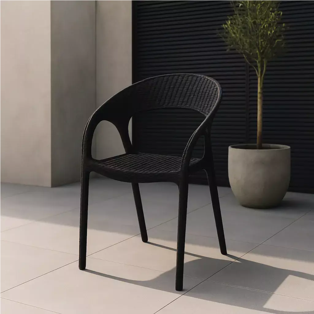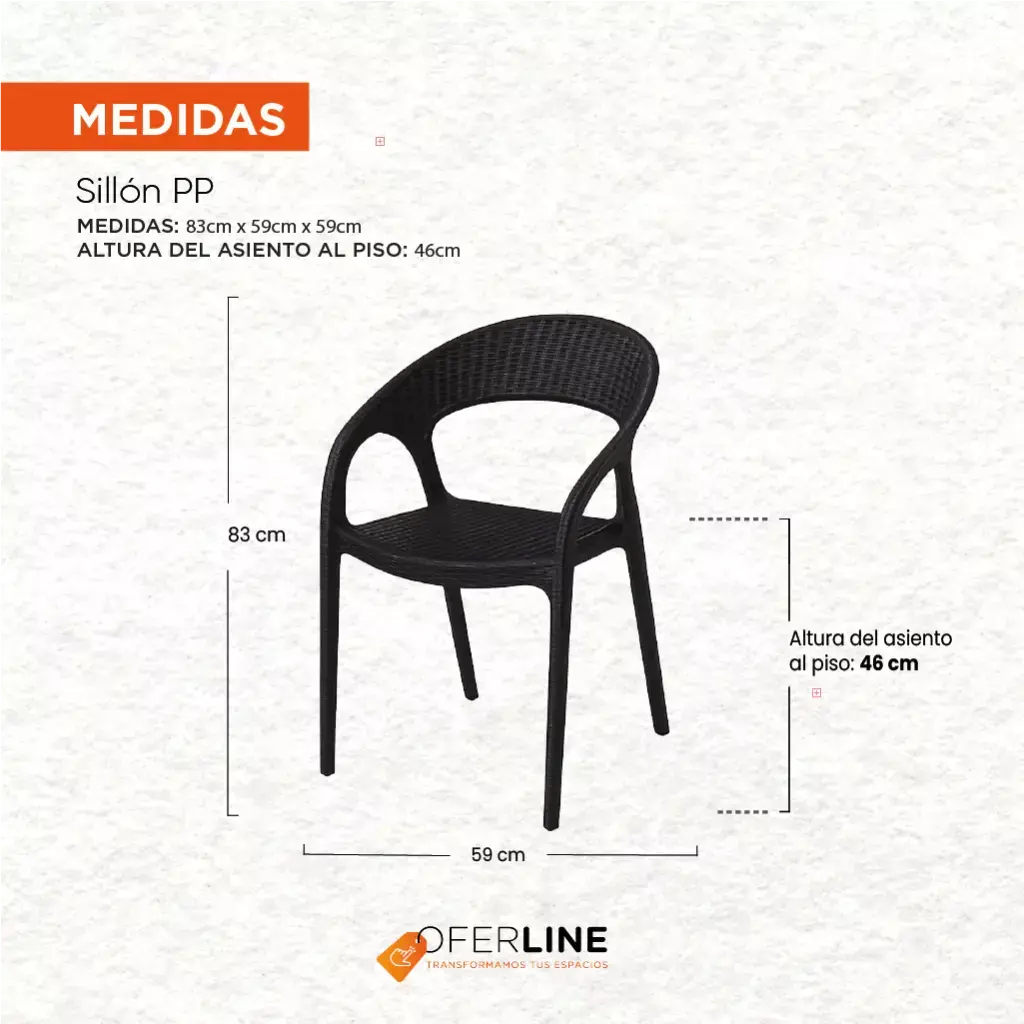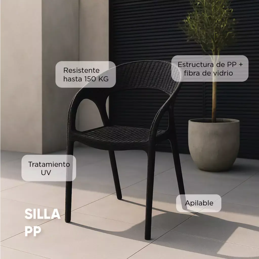 Sillón de Polipropileno (PP) + Fibra de Vidrio reforzada, apilable y resistente al exterior, con tratamiento UV y garantía de 3 años. Resiste hasta 150kg
