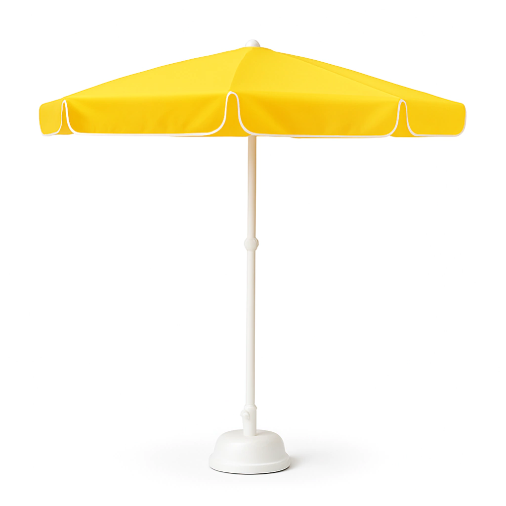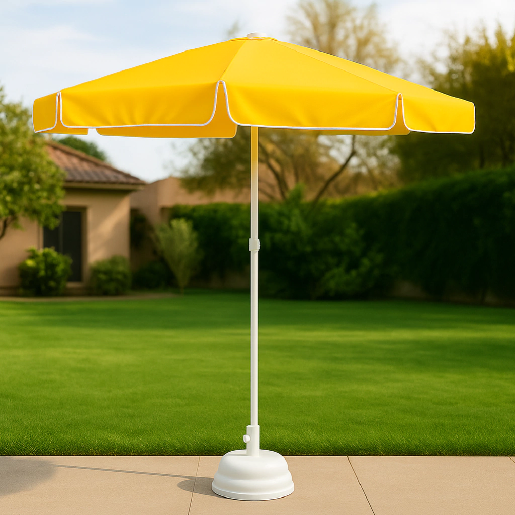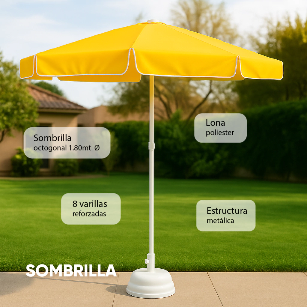 Sombrilla octogonal 1.80mt, estructura de caño reforzada. Cuenta con 8 varillas de hierro aceradas pintadas con epoxi color blanco. Lona poliester amarilla.