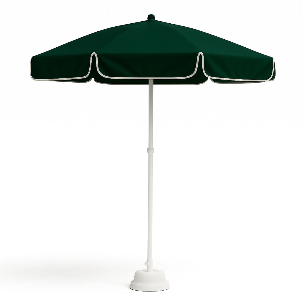 Sombrilla octogonal de 1.80mt, estructura de caño reforzada. Cuenta con 8 varillas de hierro aceradas pintadas con epoxi color blanco. Lona poliester verde.